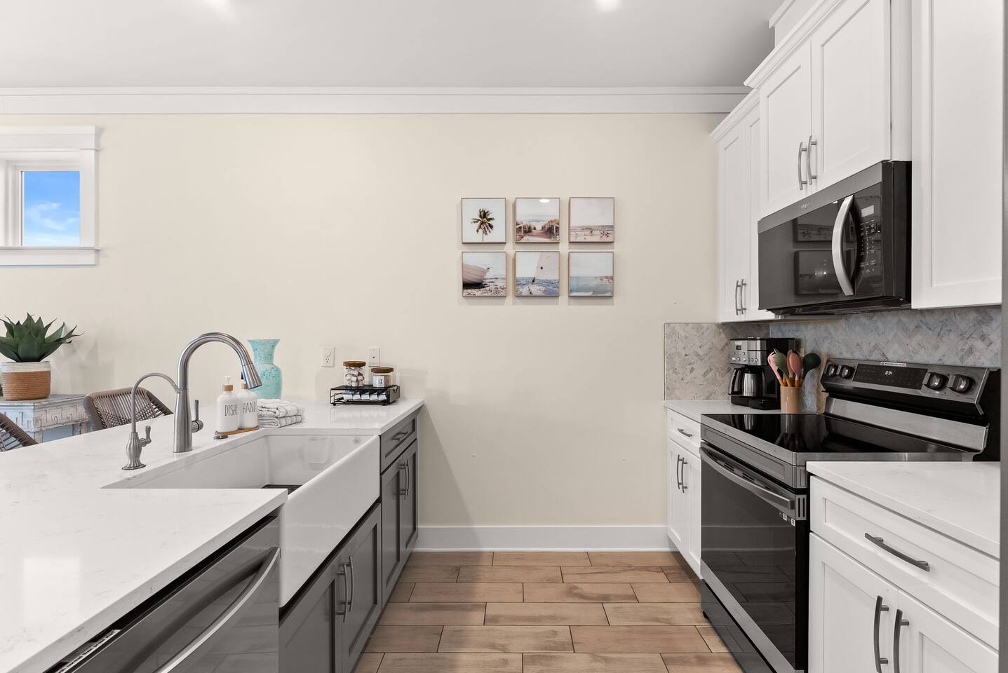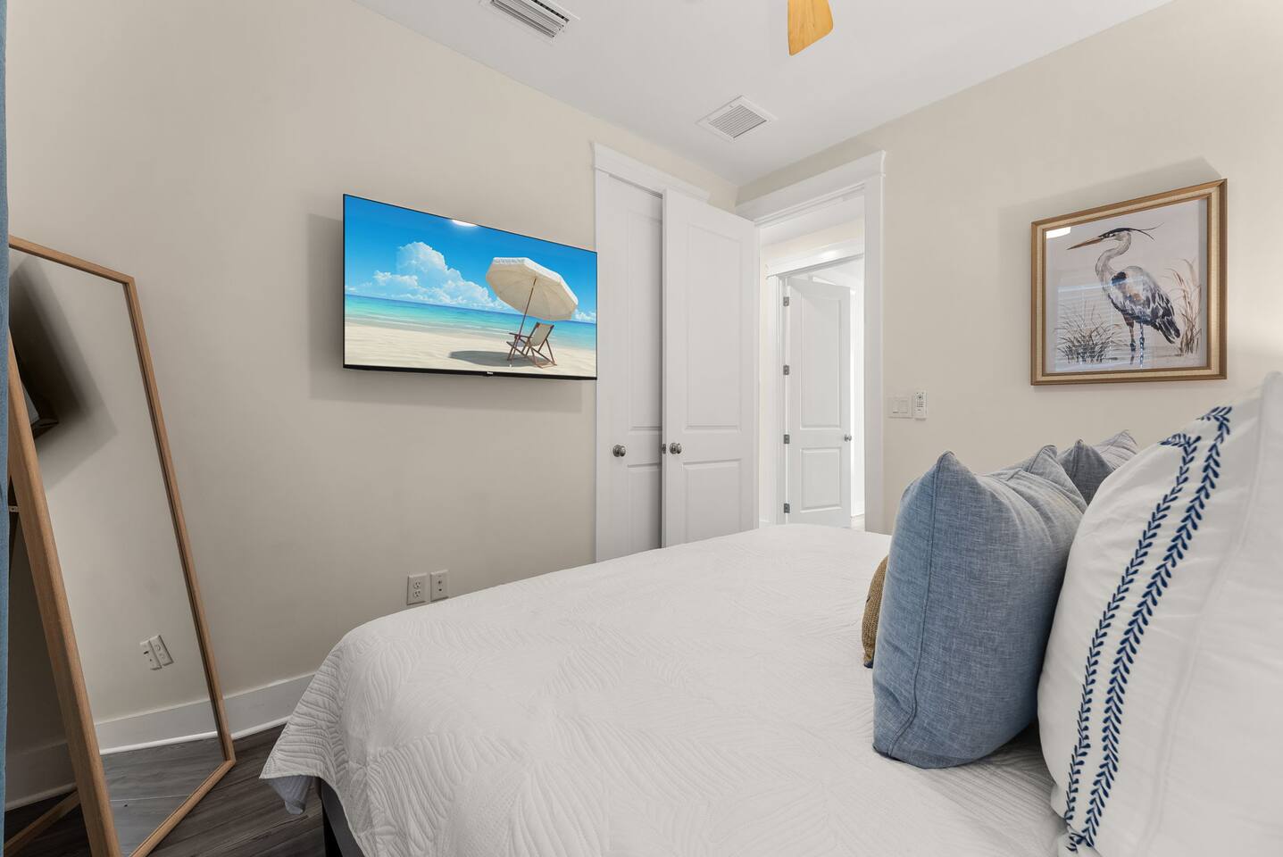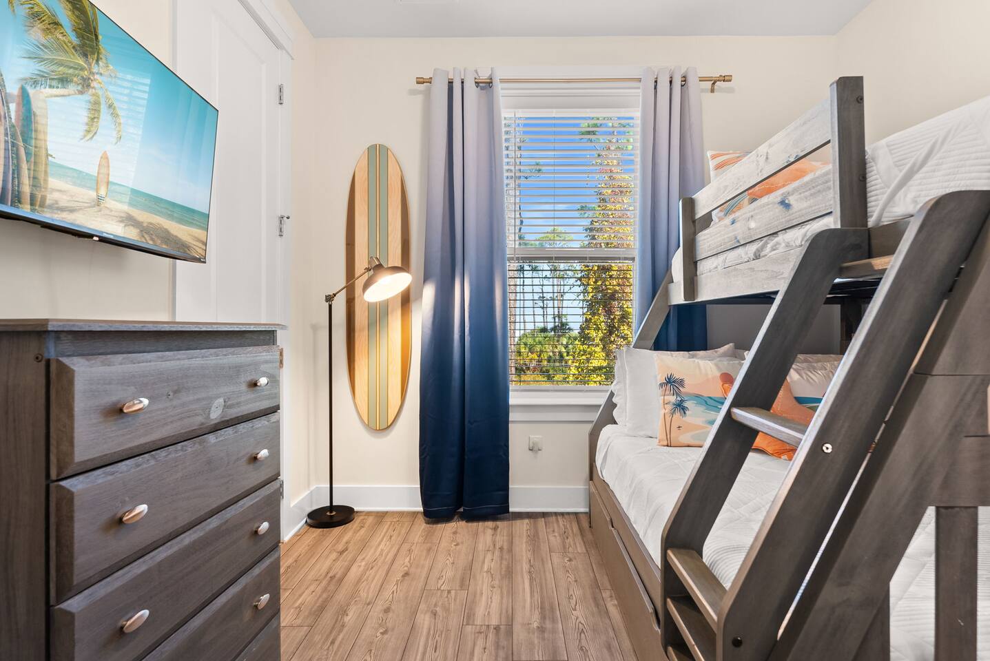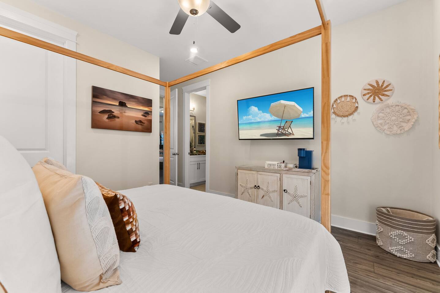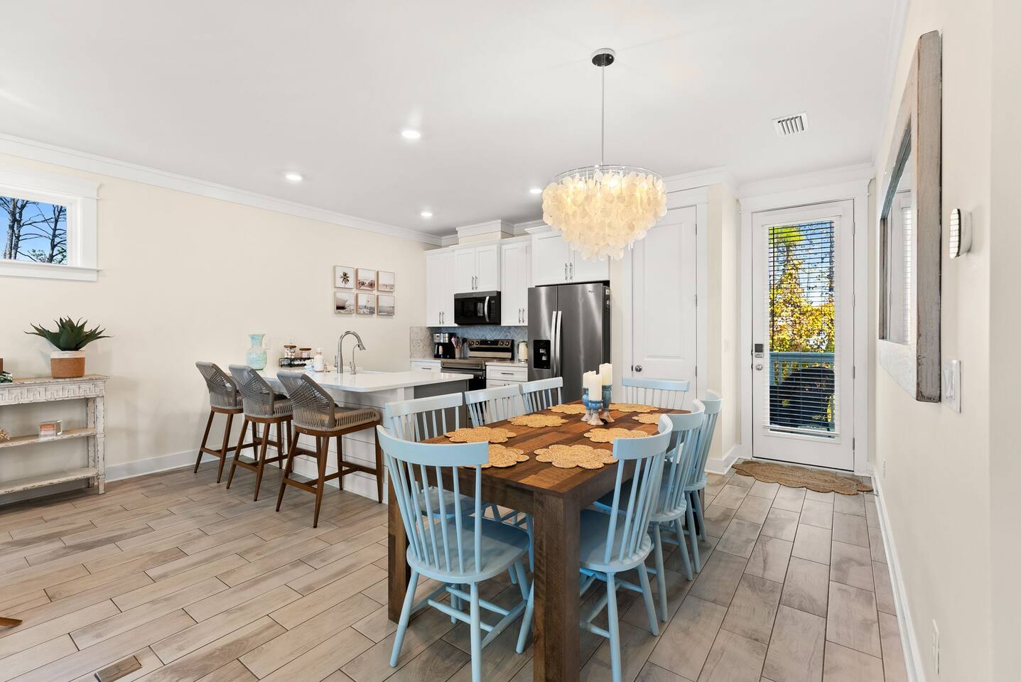 Welcome to Sunset Martini, a beautifully designed 5-bedroom, 3-bath coastal retreat just a very short walk from the white sands of Cape San Blas. Perfect for families and groups, this home blends modern coastal style, thoughtful amenities, and relaxed comfort in an easy, laid-back setting. Well-behaved dogs are welcome, so your whole crew can enjoy the getaway together. 🌿 Bright, Modern Coastal Interiors Step into light-filled, airy spaces designed for relaxation and gathering: -Spacious open living + dining area with plush furnishings -Fully equipped kitchen (quality cookware, Ninja blender, -Crockpot, toaster and so much more!) -Luxury toiletries provided -Smart TVs throughout -Designer wallpaper and curated décor in every bedroom -Lux quality sheets in all bedrooms -Books, board games & beach gear for effortless fun -Easy Self-Check In via Smart Lock -Perfect for families who want both comfort and style. ☕ Master Suite Retreat Your private master suite is made for slow mornings and quiet moments: -In-suite Keurig coffee bar -Private porch with peekaboo Gulf and sunrise views -Premium king bed & en-suite bathroom -A calming escape while the rest of the house wakes up. 🛏 Sleeping Arrangements (Sleeps 11) All bedrooms include premium mattresses and Roku Smart TVs: King Primary Suite — porch, coffee bar, en-suite bath King Bedroom 2- bay views King Bedroom 3- access to front porch with peekaboo gulf views King Bedroom 4- Bay Views Bunk Room — twin-over-full with trundle (great for kids) The downstairs level features the main living area with the kitchen, direct access to the back porch, and a king bedroom conveniently located across from a full bathroom with a walk-in shower. Perfect for multigenerational families or guests who prefer fewer stairs. The Upstairs area features 4 bedrooms (3 King, 1 Bunk) and two bathrooms as well as a full-size washer and dryer for your convenience. Enjoy access to the upstairs front porch from two King Bedrooms. Family-friendly extras include: 2 highchairs, pack & play, medium dog crate, and a rolling cooler — provided to make your stay simple and stress-free. ✨ Outdoor Living — Magical Day to Night Unwind outside with peaceful bay views and cozy touches: -Back patio overlooking St. Joseph Bay -Twinkle lights for evening ambiance -Premium propane grill -Comfortable lounge seating Ideal for grilling, gathering, and enjoying the Gulf breeze. 🏖 Community Amenities (Villa del Sol) Your stay includes exclusive access to: -Two pickleball courts (rackets included) -Beach volleyball court (volleyball provided) -Large resort-style pool -Beach Boardwalk Something for every age and energy level. 🌊 Short Walk to the Beach Just a super short walk brings you to the quiet, uncrowded shores of Cape San Blas — perfect for: Shelling Swimming Building sandcastles Sunset strolls Morning walks with your dog Bonfires This area is known for wildlife, calm waters, and family-friendly beaches. 📍 Nearby Attractions You’re close to the best of Cape San Blas & Port St. Joe: Salinas Park – 5 min (pickleball, playground, bayside trails) St. Joseph Peninsula State Park – 15 min Downtown Port St. Joe – 15–18 min (restaurants, boutiques, marina) Indian Pass Raw Bar – 10–12 min Apalachicola – 25–30 min Mexico Beach – 25–30 min