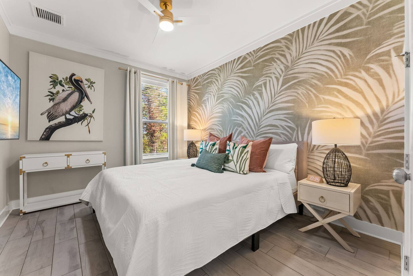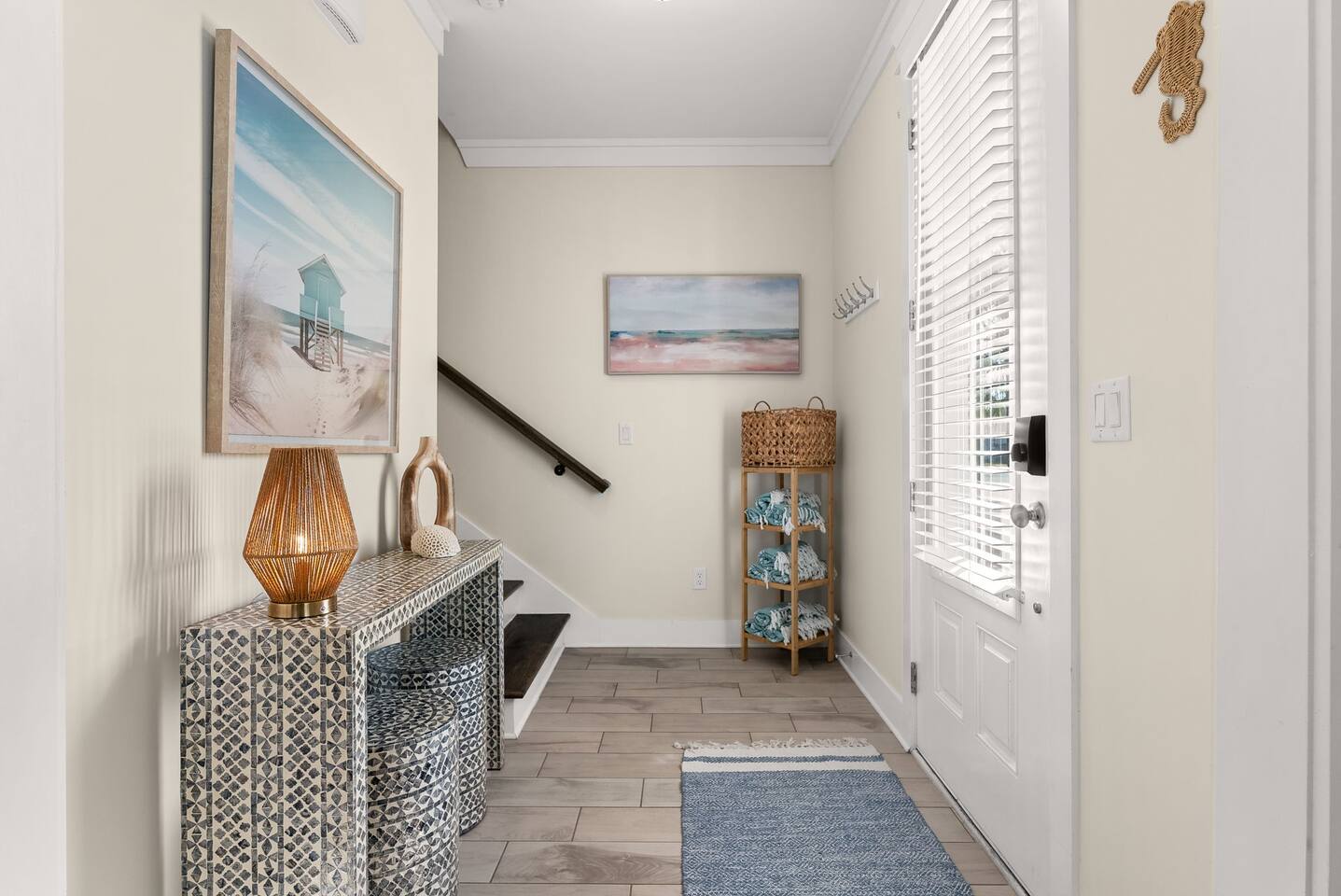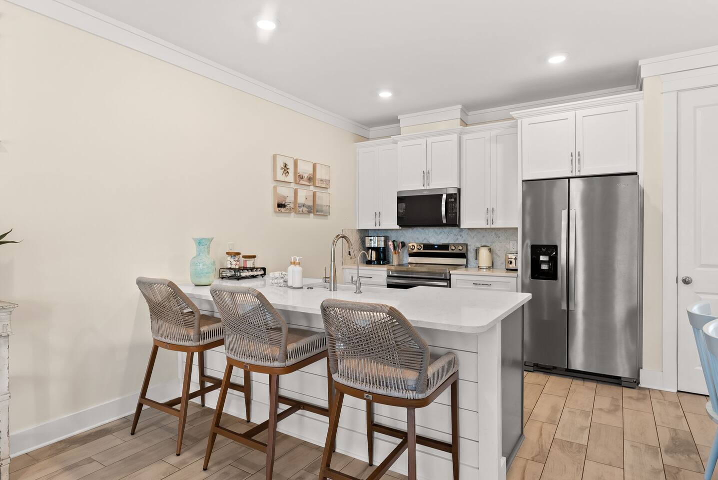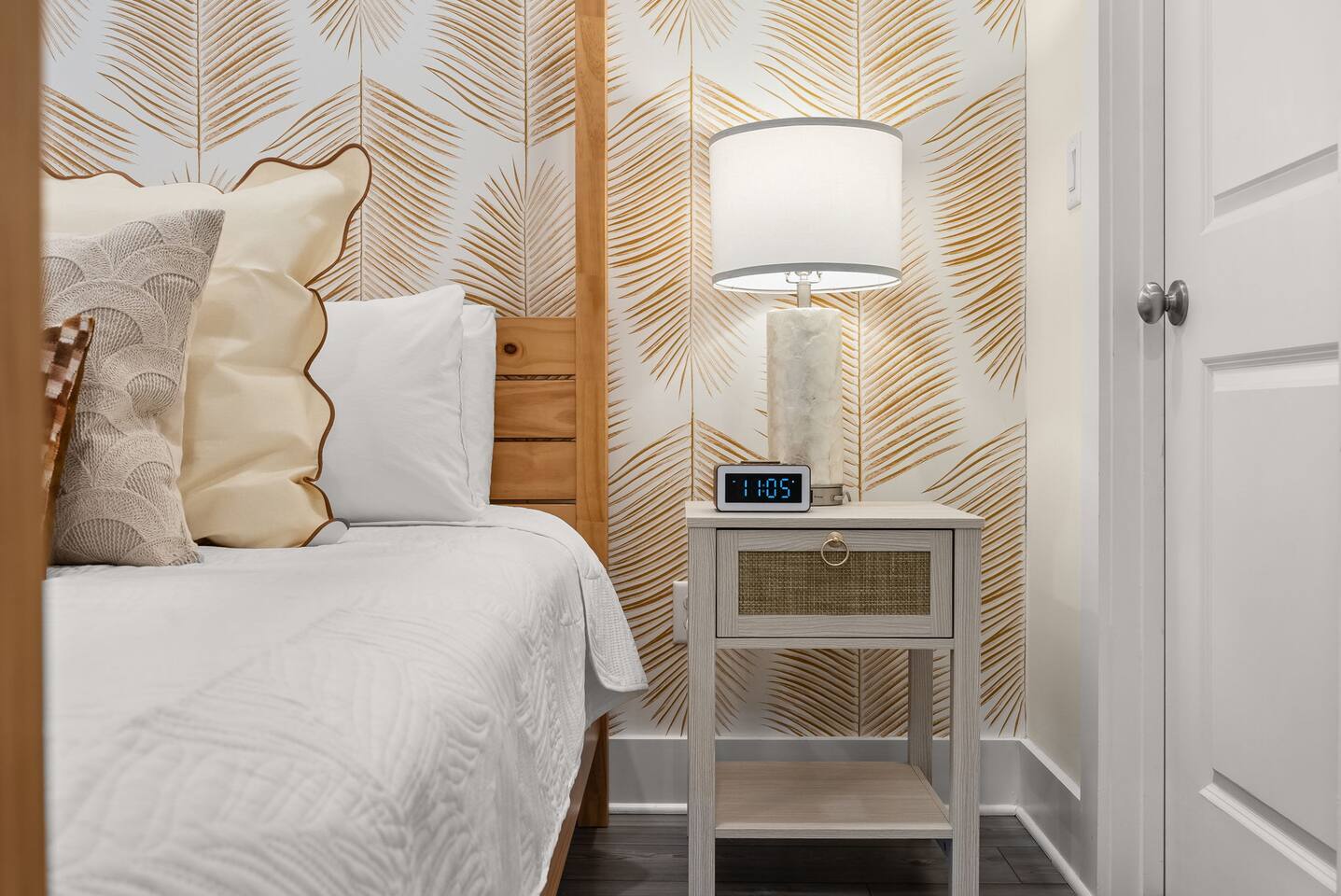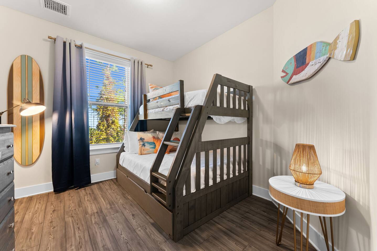 Welcome to Sunset Martini, a beautifully designed 5-bedroom, 3-bath coastal retreat just a very short walk from the white sands of Cape San Blas. Perfect for families and groups, this home blends modern coastal style, thoughtful amenities, and relaxed comfort in an easy, laid-back setting. Well-behaved dogs are welcome, so your whole crew can enjoy the getaway together. 🌿 Bright, Modern Coastal Interiors Step into light-filled, airy spaces designed for relaxation and gathering: -Spacious open living + dining area with plush furnishings -Fully equipped kitchen (quality cookware, Ninja blender, -Crockpot, toaster and so much more!) -Luxury toiletries provided -Smart TVs throughout -Designer wallpaper and curated décor in every bedroom -Lux quality sheets in all bedrooms -Books, board games & beach gear for effortless fun -Easy Self-Check In via Smart Lock -Perfect for families who want both comfort and style. ☕ Master Suite Retreat Your private master suite is made for slow mornings and quiet moments: -In-suite Keurig coffee bar -Private porch with peekaboo Gulf and sunrise views -Premium king bed & en-suite bathroom -A calming escape while the rest of the house wakes up. 🛏 Sleeping Arrangements (Sleeps 11) All bedrooms include premium mattresses and Roku Smart TVs: King Primary Suite — porch, coffee bar, en-suite bath King Bedroom 2- bay views King Bedroom 3- access to front porch with peekaboo gulf views King Bedroom 4- Bay Views Bunk Room — twin-over-full with trundle (great for kids) The downstairs level features the main living area with the kitchen, direct access to the back porch, and a king bedroom conveniently located across from a full bathroom with a walk-in shower. Perfect for multigenerational families or guests who prefer fewer stairs. The Upstairs area features 4 bedrooms (3 King, 1 Bunk) and two bathrooms as well as a full-size washer and dryer for your convenience. Enjoy access to the upstairs front porch from two King Bedrooms. Family-friendly extras include: 2 highchairs, pack & play, medium dog crate, and a rolling cooler — provided to make your stay simple and stress-free. ✨ Outdoor Living — Magical Day to Night Unwind outside with peaceful bay views and cozy touches: -Back patio overlooking St. Joseph Bay -Twinkle lights for evening ambiance -Premium propane grill -Comfortable lounge seating Ideal for grilling, gathering, and enjoying the Gulf breeze. 🏖 Community Amenities (Villa del Sol) Your stay includes exclusive access to: -Two pickleball courts (rackets included) -Beach volleyball court (volleyball provided) -Large resort-style pool -Beach Boardwalk Something for every age and energy level. 🌊 Short Walk to the Beach Just a super short walk brings you to the quiet, uncrowded shores of Cape San Blas — perfect for: Shelling Swimming Building sandcastles Sunset strolls Morning walks with your dog Bonfires This area is known for wildlife, calm waters, and family-friendly beaches. 📍 Nearby Attractions You’re close to the best of Cape San Blas & Port St. Joe: Salinas Park – 5 min (pickleball, playground, bayside trails) St. Joseph Peninsula State Park – 15 min Downtown Port St. Joe – 15–18 min (restaurants, boutiques, marina) Indian Pass Raw Bar – 10–12 min Apalachicola – 25–30 min Mexico Beach – 25–30 min